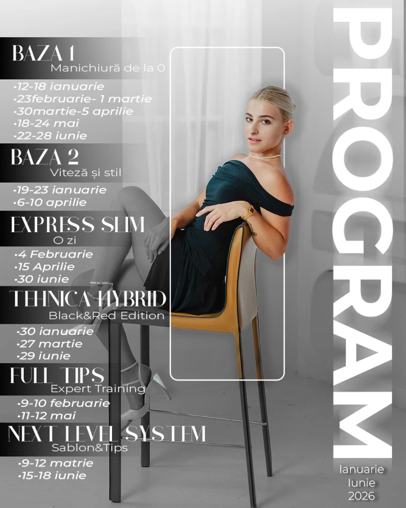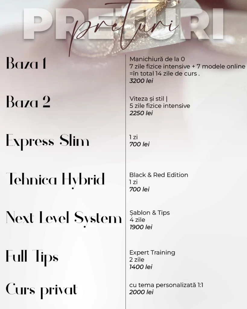 Sunt încântată să vă prezint programa cursurilor de manichiură care vor avea loc în următoarea perioadă! Aceste cursuri sunt concepute pentru a oferi o introducere în ceea ce privește realizarea manichiurii, dar și pentru a perfecționa abilitățile deja existente în acest domeniu. Indiferent de nivelul tău de experiență, vei găsi cursuri adecvate și adaptate nevoilor tale.